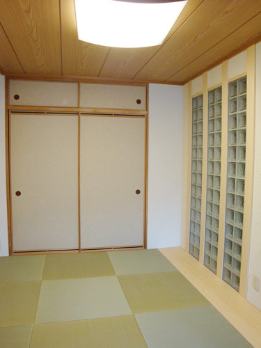 和室はモダンにしたいという事で琉球畳で畳の廻りは、縁故板を回し、障子は太鼓張でモダンな雰囲気を出しつつ日本の伝統素材和紙で柔らかさを演出しました。