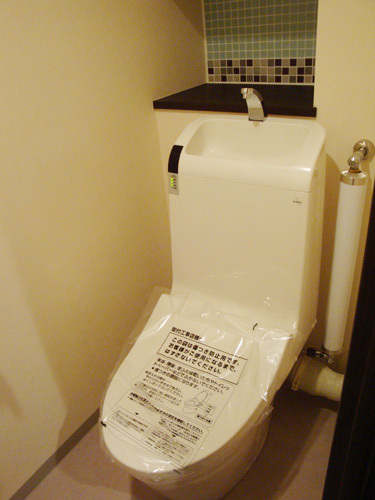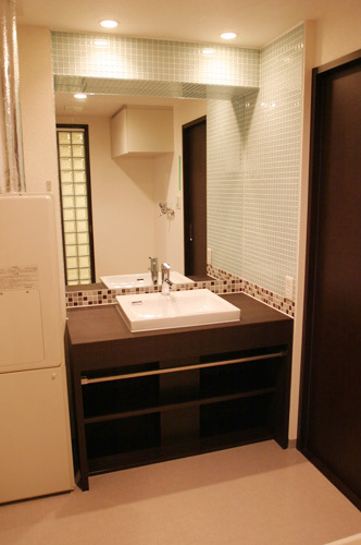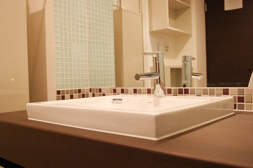 ミラーの廻りのタイルはINAXモザイクタイルとアクセントに名古屋モザイクタイルのジョイント。目地のピッチを合わせるべく柔軟な考え方で施工。