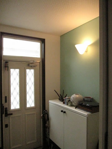 クロスにはエメラルドグリーンを選択し、見た目にもさわやかな、明るい玄関となりました。