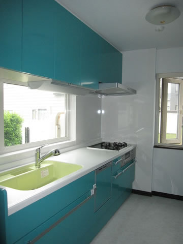 何度もショールームに足を運んで決めたこだわりのキッチンは、玄関とあわせたグリーン。