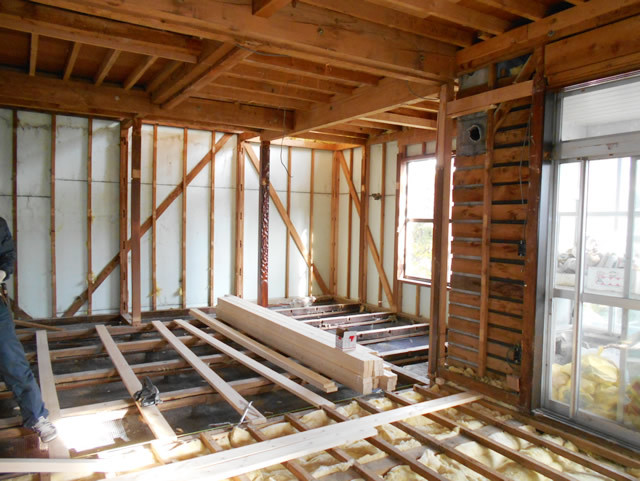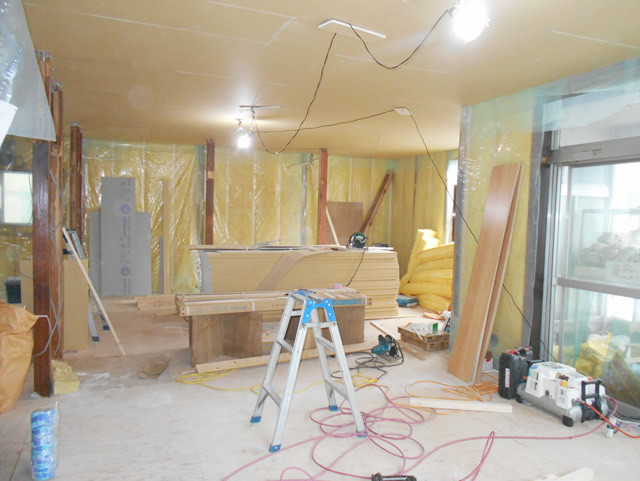 床壁天井の下地は交換してバリアフリーに。断熱材は高断熱のタイプに交換して機械式の換気扇を新設しました。