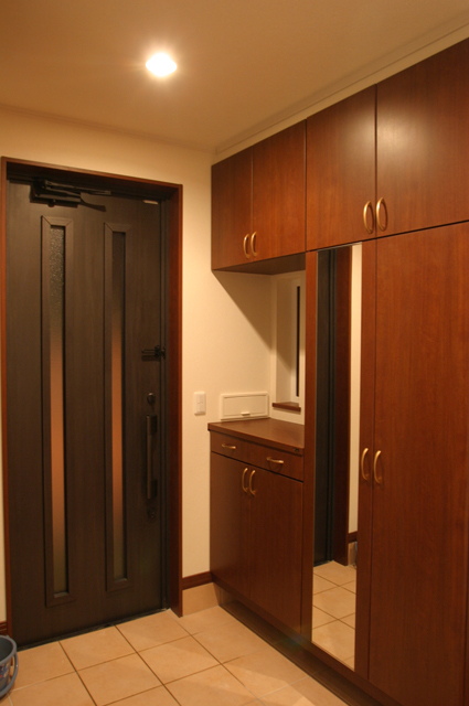 外観はタイル調で重厚感を感じるサイディング仕上げ。1階玄関収納は2世帯分を用意し、ベンチに座りながら靴をはいたり、脱いだりスムーズに動作が出来るよう工夫。和室は二間続きで南東の陽の光が造作建具(障子)より差し込むようになっています。階段廻りはラウンドシステムを取り動線を3世代が行動しやすいようなってます。リビングは庭と畑を室内からでも見て楽しめるように窓位置を配置。ダイニングはサッシを掃き出しとし、畑へ出れるようにし食事に使用されるお野菜も朝摘みを食せるようになっております。壁面には造作家具でサイズをぴったり作成し、収納に便利です。ダイニングテーブルも食事だけではなく、読書の時間であったり裁縫の机になったりと 活用したい奥様の気持ちがそこにあります。キッチンはIHヒーター+食洗機+たっぷり収納で食器棚をすっきりとする事が出来ました。淡いグリーンでキッチンも爽やかです。キッチンからリビングを通らず、収納、トイレ、ユーティリティへと繋がりお子さん達もお客様がリビングに居らしていても気がねなくお風呂に入る事が出来ます。トイレは将来の事を考え、車椅子でも良いよう少々広めに。階段下は収納に空間を活用。2階はお布団を干せるようバルコニーが付いてます。廊下には本棚+机を造作で用意。洗面所+トイレが付いてます。各個室が4部屋あり、主寝室のクローゼットは既存のタンスが入るよう広く取ってます。お父さんの書斎(パソコン)も用意されてます。