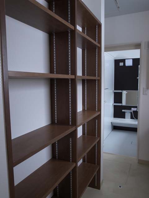 脱衣室 収納棚:天井には電動物干しも