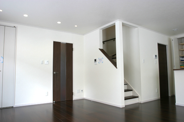 リビング: 階段の壁をオープンにしたことで、 開放感がアップ。 リビング: 階段の壁をオープンにしたことで、 開放感がアップ。
