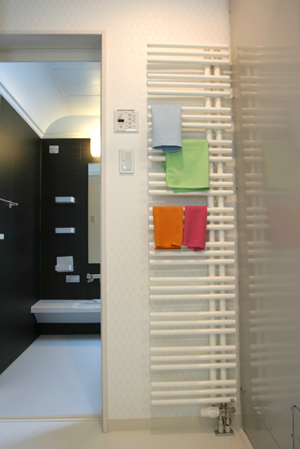 電気ヒーター:デザイン性もあるヒーターは、タオルを掛けるのにちょうどいい。乾きも早い!
