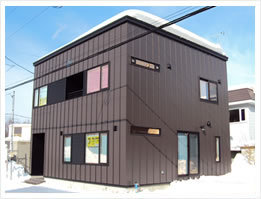 玄関ドア:板金の壁に、スタイリッシュなデザインのドアが合います。