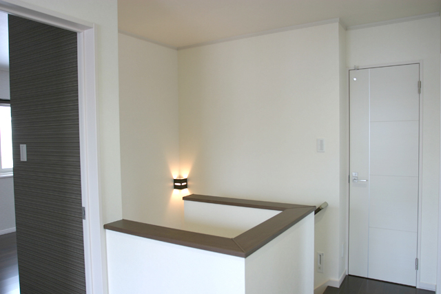 階段ホール:シンプルですが、ドアのデザインやブラケットライトがアクセントになっています。