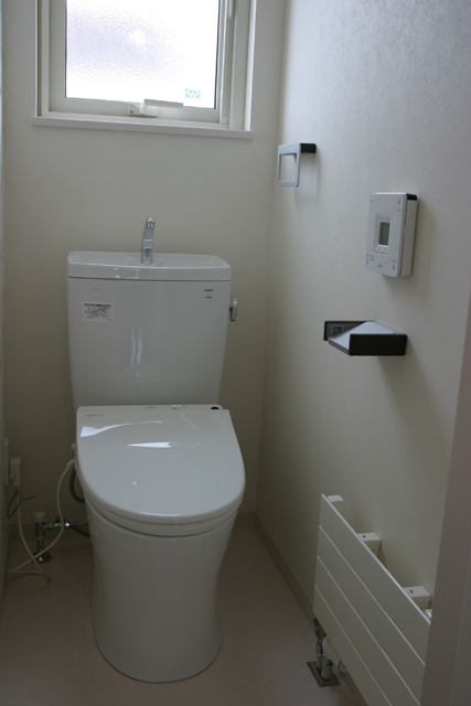 1階トイレ:背面にタンクが収まっているので見た目スッキリ。家族以外も使う1階のトイレには手洗いカウンターがあると便利。