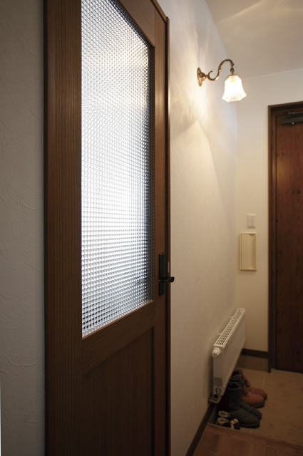 リビングドア: チェッカーガラスのリビングドアと ブラケット照明がアンティークな雰囲気を 醸すリビングの入口。 リビングドア: チェッカーガラスのリビングドアと ブラケット照明がアンティークな雰囲気を 醸すリビングの入口。