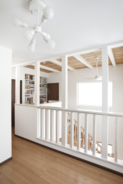 書斎:2階ホールに本棚とカウンターを設けて書斎に。お子さんのスタディスペースやパソコンスペース等多目的に活用できます。