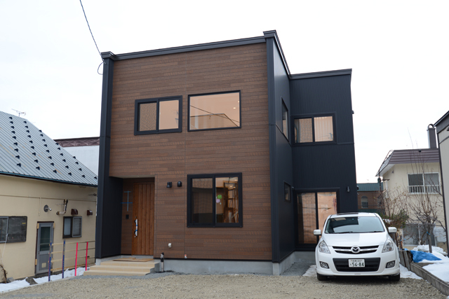 外観:黒の金属サイディングとウッドの組合せでかっこよく仕上げた外観。