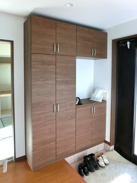 玄関ホール:家族の靴をたっぷり収納しながらも季節のしつらえを楽しめるシューズボックス。