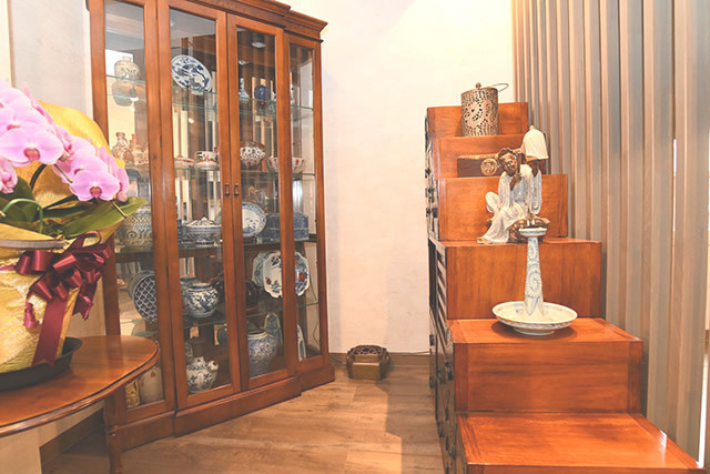 店内には江戸時代の階段箪笥をはじめ、国内外の骨董品、室町時代の甲冑を展示中です。