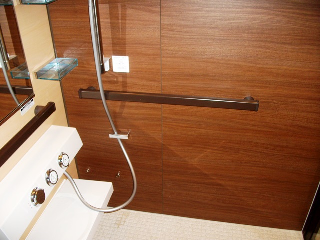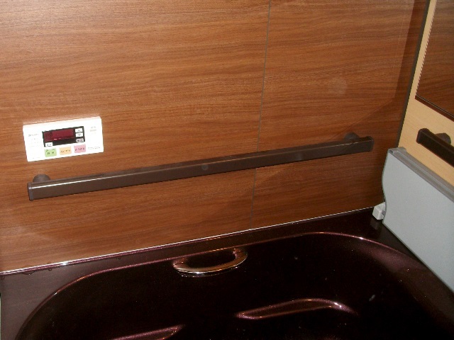 今回取付したユニットバスは LIXILの「リノビオV」。浴室内の動線をぐるりと囲う手すりや、浴槽において、腰かけることもできる浴槽フタなどお母様の入浴をサポートする「サポートパック」のオプションを採用しました。