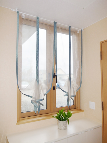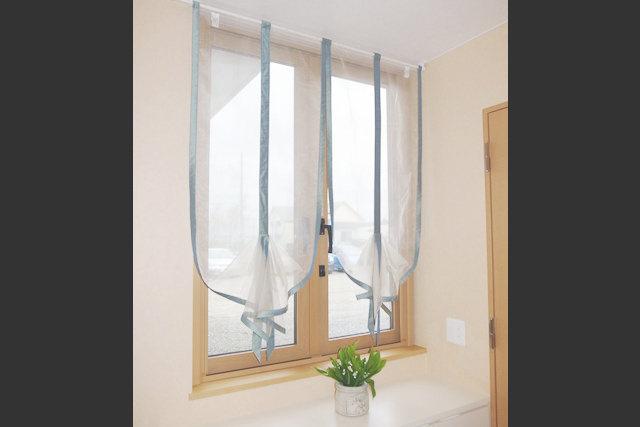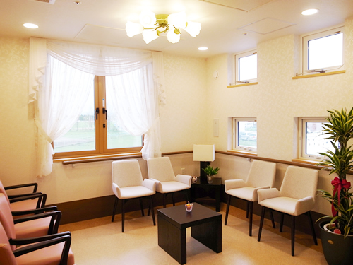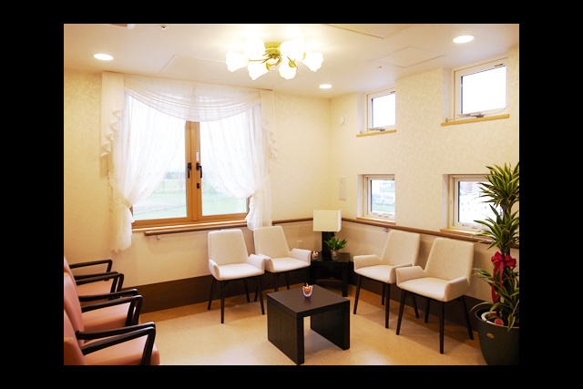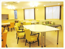 談話コーナー:スタイルカーテンがポイント、入居者様の憩いの場