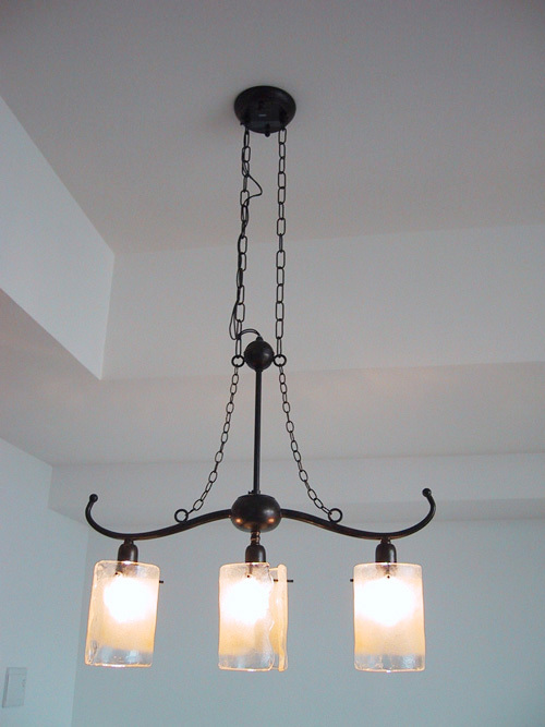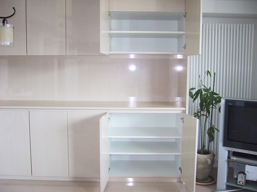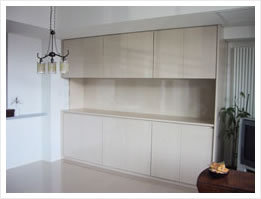 新築マンションの造作工事のご紹介。インテリアはポイントから繋げていくと統一感が出てくる事をご存知の奥様でヨーロピアン調のダイニングテーブルをお持ちでしたので、シャンデリアはアイアンアンティークを選ばれました。蛍光灯の照明はなくダウンライトで空間を演出。壁面が白いクロスで施工された4mと大きな空間に造作家具を作成したいとご依頼を頂き、イメージを伺い 図面を作成。マンションは凹凸がある壁天井なのでそこを綺麗に隠しつつ家具が美しく見えるデザインというご希望でした。収納される内容を伺いながら進めて参ります。取手をつけず加工で手が入るようになっています。