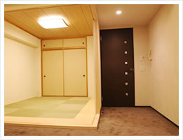 和室はモダンにしたいという事で琉球畳で畳の廻りは、縁故板を回し、障子は太鼓張でモダンな雰囲気を出しつつ日本の伝統素材和紙で柔らかさを演出しました。