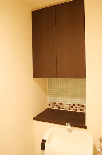 ミラーの廻りのタイルはINAXモザイクタイルとアクセントに名古屋モザイクタイルのジョイント。目地のピッチを合わせるべく柔軟な考え方で施工。