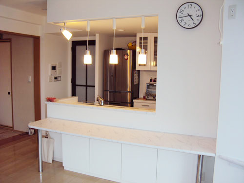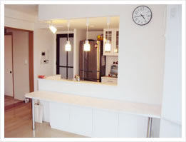 リビングにはエコカラット。和室は床の間を造作しながらも狭さを感じさせない作り。キッチンは吊戸を撤去し開放的な空間を演出、ダイニング+TELカウンターを造作し実用的な空間の確保。