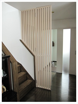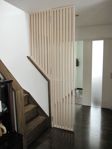 明かりをとおしつつも、視界をさえぎる扉へ交換しさらに、柔らかに視界を遮る木製のパーテーションを取付け、2重の対策を。