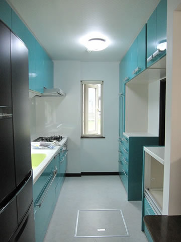 何度もショールームに足を運んで決めたこだわりのキッチンは、玄関とあわせたグリーン。