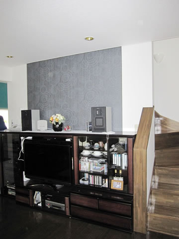 TV台の後ろにクロスでアクセント。お部屋がぐっとひきしまりました。