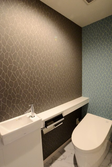トイレは色違いのクロスも柄を合わせることで、統一感をだしました。