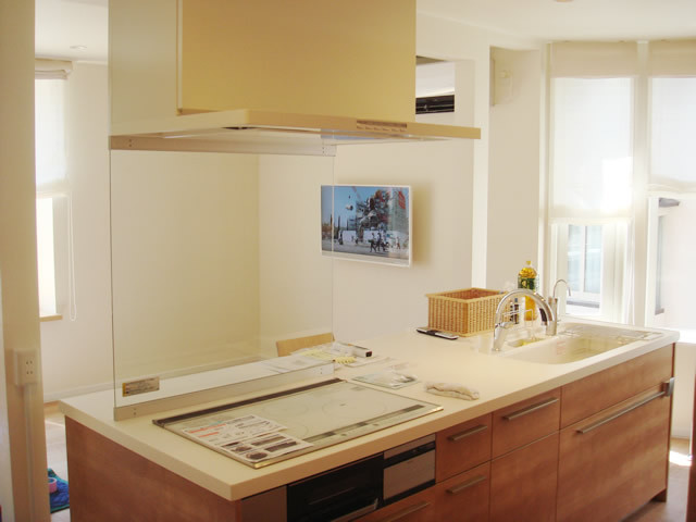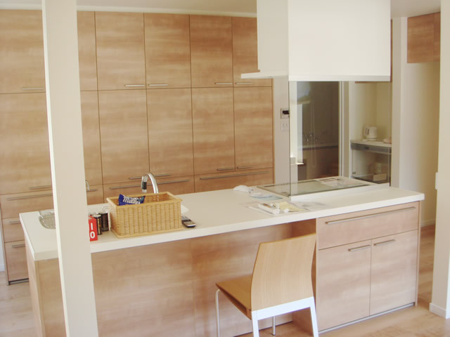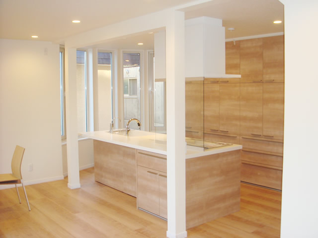 閉鎖的なキッチンは、リビングとつなげる事により開放的で明るいキッチンとなり、リビング、ユーティリティー、個室、玄関へと回遊できる動線、普段の動線と必要な各設備の配置をあわせ無駄のない間取りが完成しました。