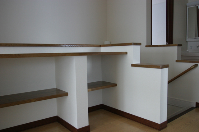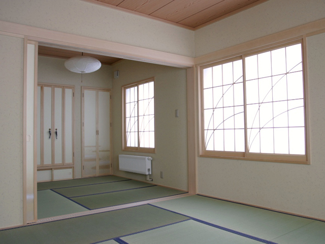 外観はタイル調で重厚感を感じるサイディング仕上げ。1階玄関収納は2世帯分を用意し、ベンチに座りながら靴をはいたり、脱いだりスムーズに動作が出来るよう工夫。和室は二間続きで南東の陽の光が造作建具(障子)より差し込むようになっています。階段廻りはラウンドシステムを取り動線を3世代が行動しやすいようなってます。リビングは庭と畑を室内からでも見て楽しめるように窓位置を配置。ダイニングはサッシを掃き出しとし、畑へ出れるようにし食事に使用されるお野菜も朝摘みを食せるようになっております。壁面には造作家具でサイズをぴったり作成し、収納に便利です。ダイニングテーブルも食事だけではなく、読書の時間であったり裁縫の机になったりと 活用したい奥様の気持ちがそこにあります。キッチンはIHヒーター+食洗機+たっぷり収納で食器棚をすっきりとする事が出来ました。淡いグリーンでキッチンも爽やかです。キッチンからリビングを通らず、収納、トイレ、ユーティリティへと繋がりお子さん達もお客様がリビングに居らしていても気がねなくお風呂に入る事が出来ます。トイレは将来の事を考え、車椅子でも良いよう少々広めに。階段下は収納に空間を活用。2階はお布団を干せるようバルコニーが付いてます。廊下には本棚+机を造作で用意。洗面所+トイレが付いてます。各個室が4部屋あり、主寝室のクローゼットは既存のタンスが入るよう広く取ってます。お父さんの書斎(パソコン)も用意されてます。