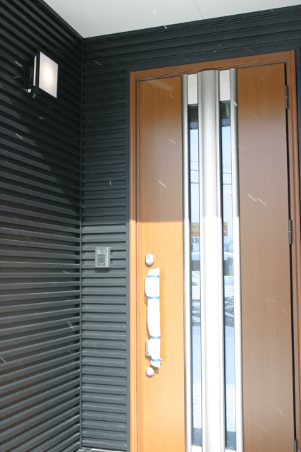 玄関ドア:板金の壁に、スタイリッシュなデザインのドアが合います。