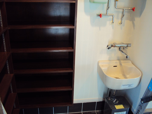 電気温水器:電気温水器と洗面化粧台。置き場所に困る体重計は、化粧台下部の引出しに収納。