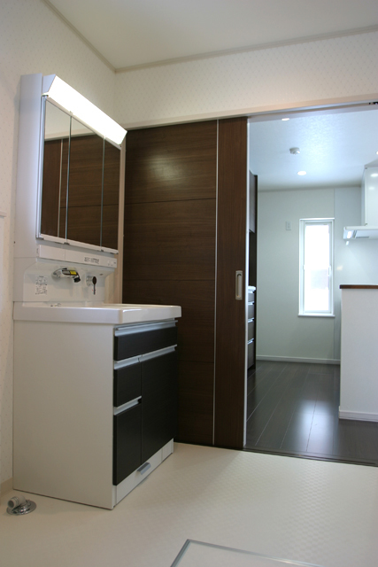 洗面化粧室~キッチン: 家事動線もばっちり。 洗面化粧室~キッチン: 家事動線もばっちり。
