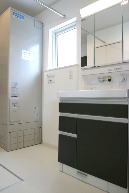 電気温水器: 電気温水器と洗面化粧台。 置き場所に困る体重計は、 化粧台下部の引出しに収納。 電気温水器: 電気温水器と洗面化粧台。 置き場所に困る体重計は、 化粧台下部の引出しに収納。