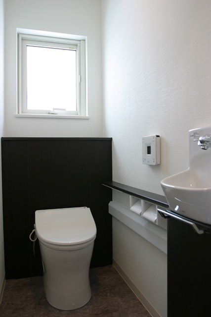1階トイレ:背面にタンクが収まっているので見た目スッキリ。家族以外も使う1階のトイレには手洗いカウンターがあると便利。
