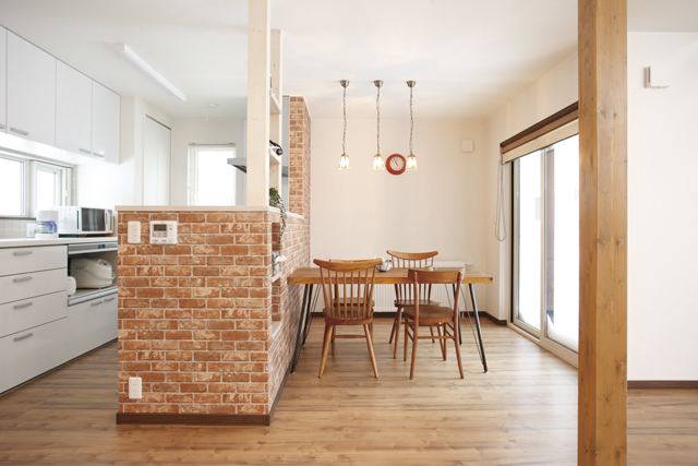 ダイニング:レンガ調の壁紙に、デザイン違いの椅子がアクセント。