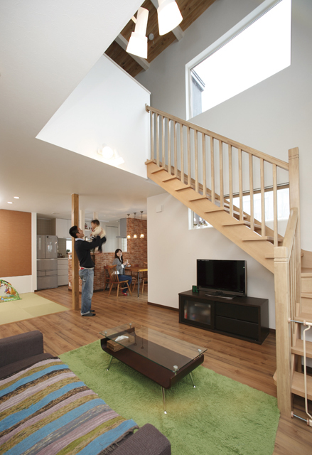 リビング:吹抜けに階段を設けることで家族のコミュニケーションに配慮し「家族のつながり」を感じるリビング。