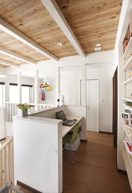 書斎:2階ホールに本棚とカウンターを設けて書斎に。お子さんのスタディスペースやパソコンスペース等多目的に活用できます。
