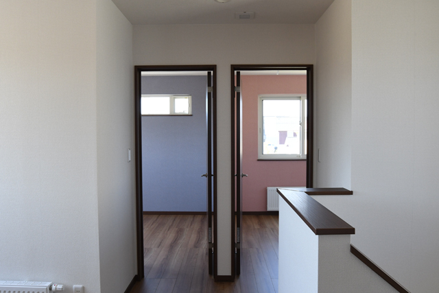 2階からの声・気配を感じる事ができます。外部も2台用カーポート、大型物置(約6帖分)+アスファルト、インターロッキングと日当たりや、冬場の風・積雪・道路からの視線を考え設置しました。