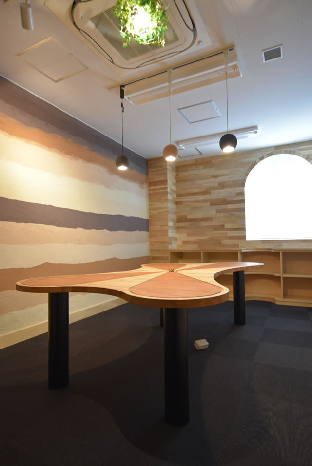 北海道原産の木壁面に使い、造作家具テーブルと、「直線」と「曲線」を交差させました。