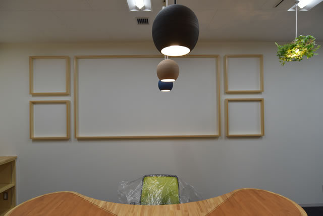 枠にとらわれない、木枠の壁・・・、矛盾するように思えますが、この枠には着想と発展の願いを込めています。依頼主様の席の向かいに位置する壁に、大小5つの「箱」にも「枠」にも見えるアートをデザインしてみました。「箱の中のユートピア」で有名なコーネルのアートより着想したものです。コーネルは木枠の箱に何でも詰め込みました。あるときはピアノを、あるときはこの惑星全体を枠の中に囲んでしまいました。するとたちまち、それはアートになります。
